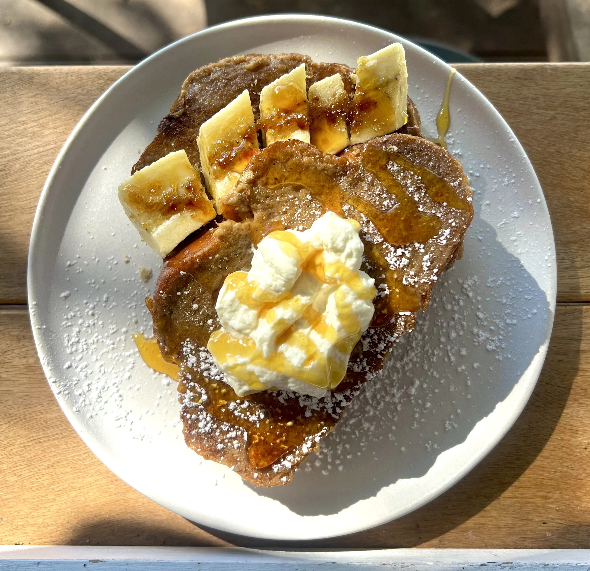 Challah bread soaked in chai-custard, topped with maple syrup, and powdered sugar
