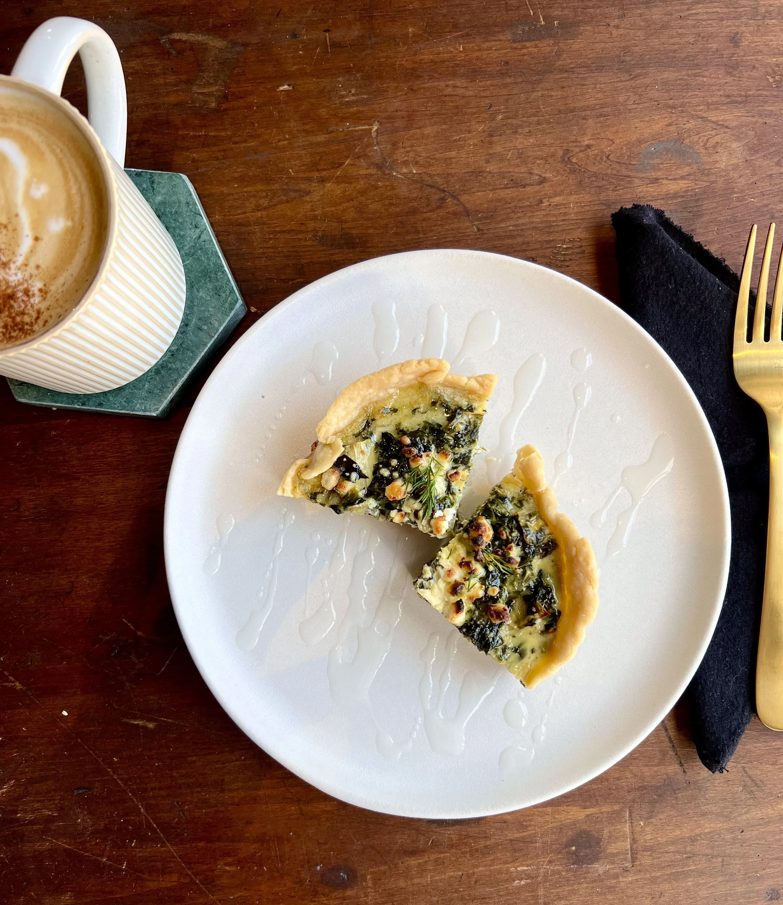 Mushroom & Goat cheese quiche with a GF crust, topped with sea salt, and shallots.